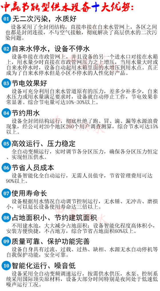1、  設(shè)備直接串聯(lián)在自來(lái)水官網(wǎng)上,不用建水池,節(jié)約大量土地和資金。